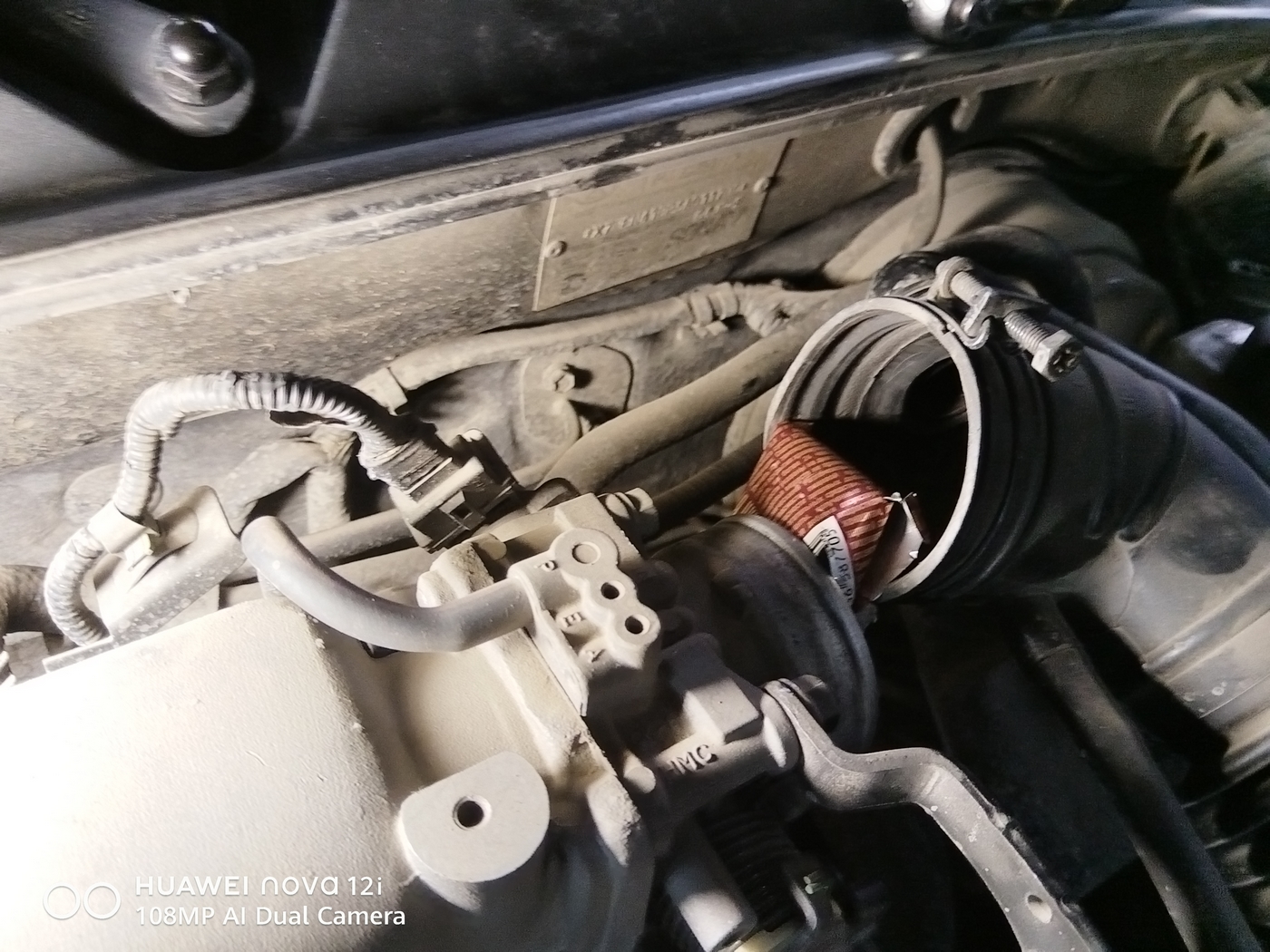 И больше ничего такого. Ну шланчик воздушный на обратный клапан топливный был надорван, он так не будет влиять. Откручиваю хомут на впускном патрубке дросселя, а там: